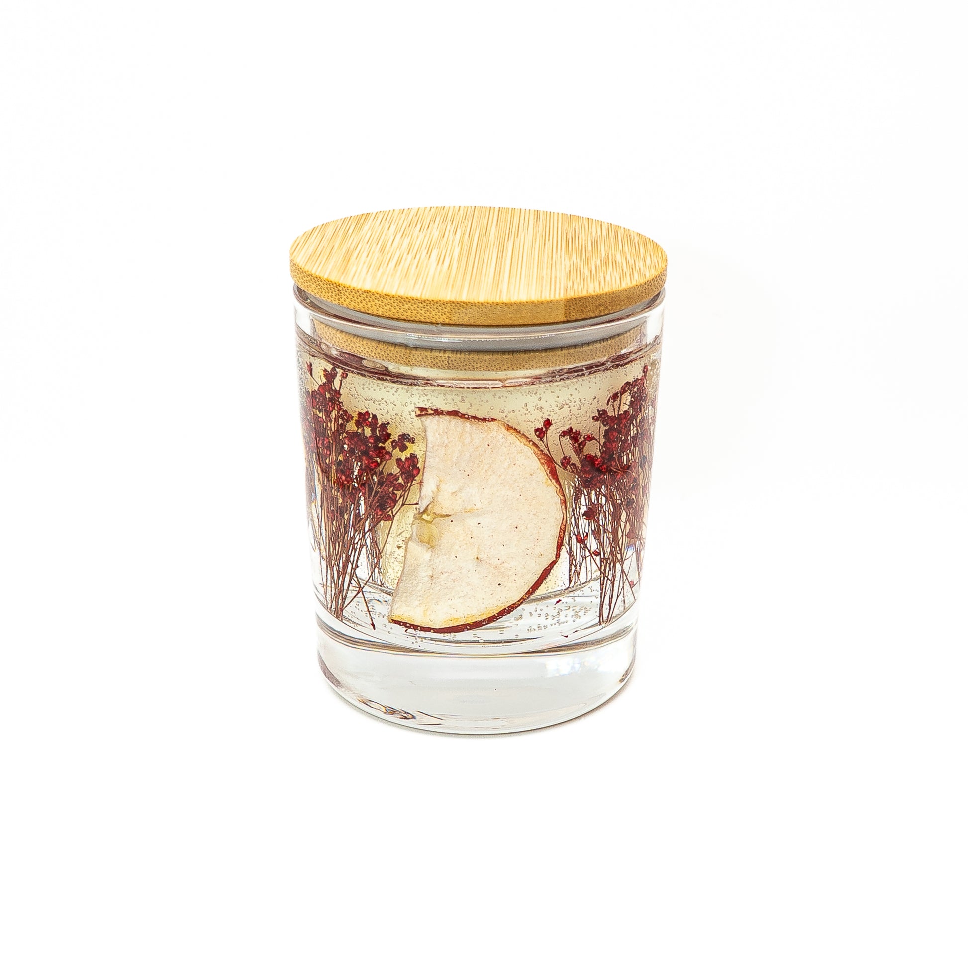 Create a cozy, nature-inspired atmosphere in your home with this stunning, hand-poured botanical gel candle. Crafted with care, each candle features real dried apple slices and delicate red flowers suspended in clear gel wax, creating a timeless and elegant design.