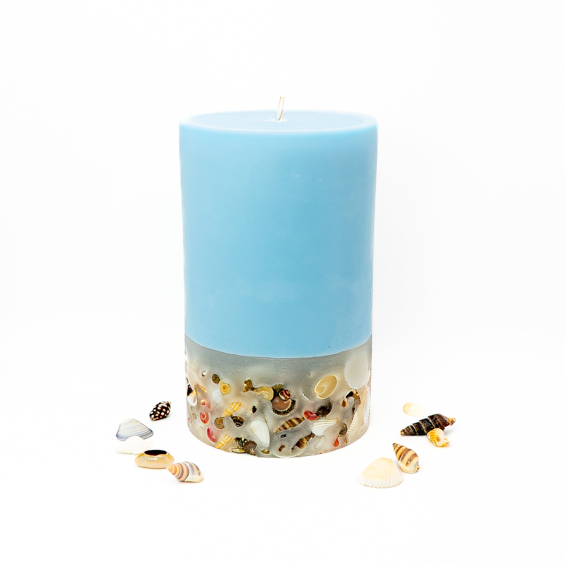 This layered pillar candle features a smooth soy wax top with a decorative lower section embedded with natural seashells, creating a calm, coastal-inspired design. The contrast between the soft pastel upper layer and the textured shell base gives the candle a clean yet expressive look.