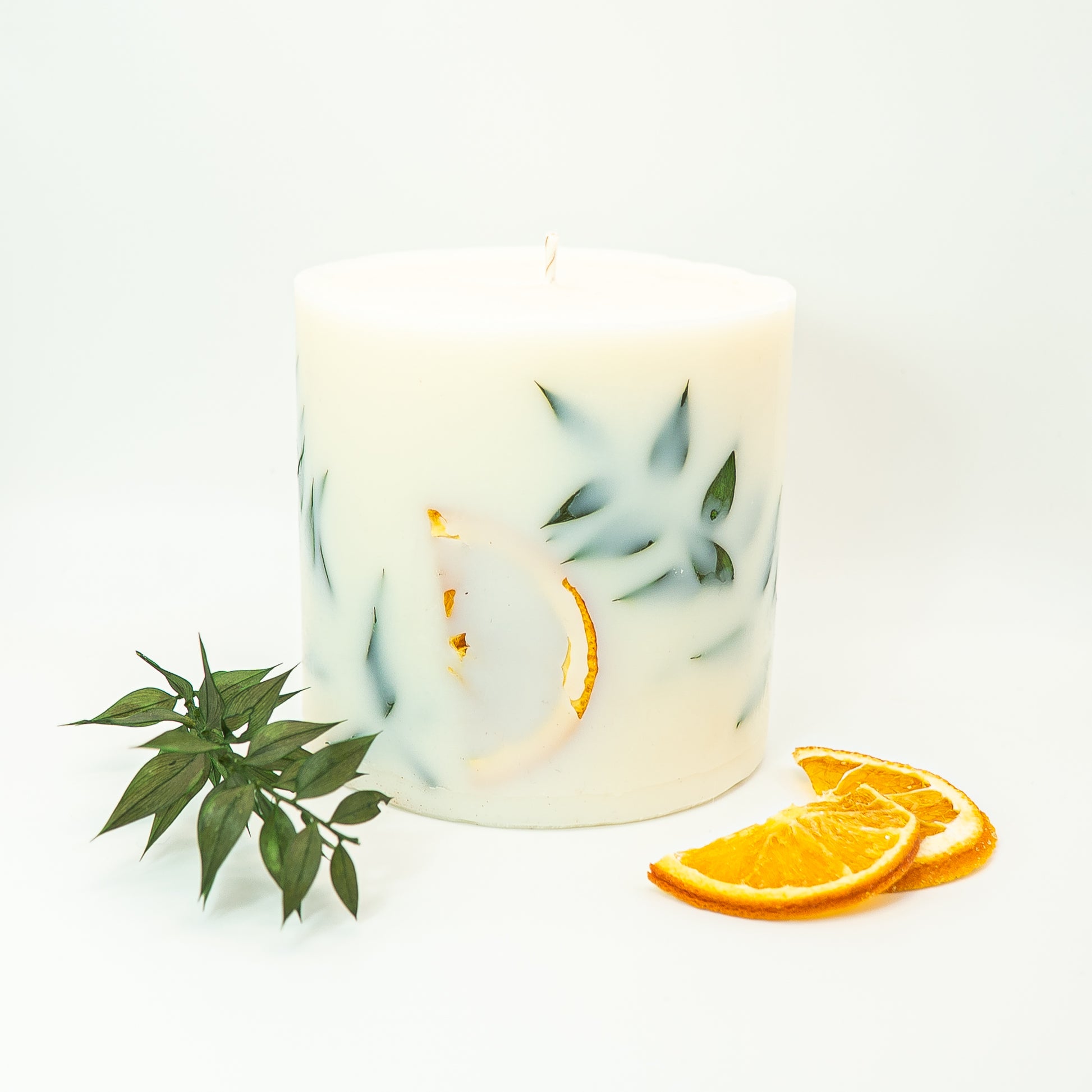 Botanical Soy Wax Pillar Candle – Orange & Greenery